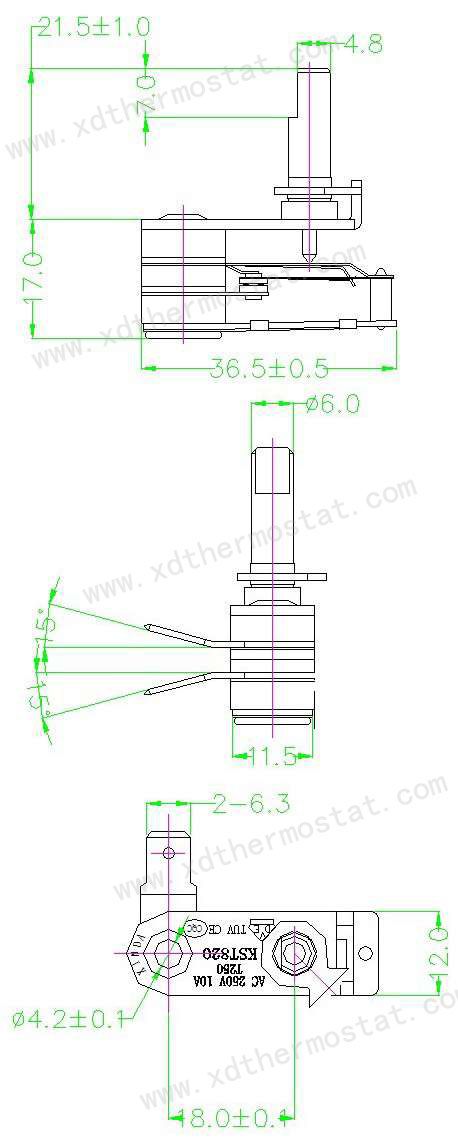 型号:KST820-16351、规格:250VAC/10A2、工作角度:270±5°3、工作温度:195±8℃4、开机角度:60±10℃(室温25℃)5、耐压:2000V/1S 击穿电流:0.5mA