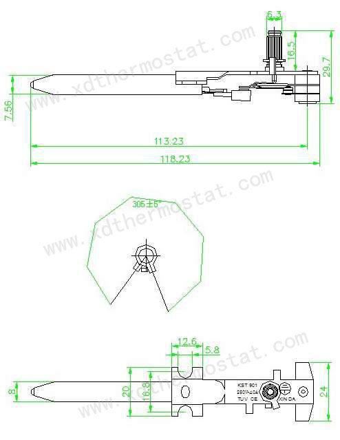 型号:KST820-1334 1、规格:250VAC/10A(外接负载) 2、工作角度:305±5° 3、成品测试:室温20℃;接通角110±40° 稳定后200-220℃,温差50℃以内 4、耐压测试:2000V/1S 击穿电流:10mA LN-接地打2000V/1s LN-外壳打4000V/1s 5、对地绝缘强度:>5MΩ 6、禁止在液态环境内使用 |