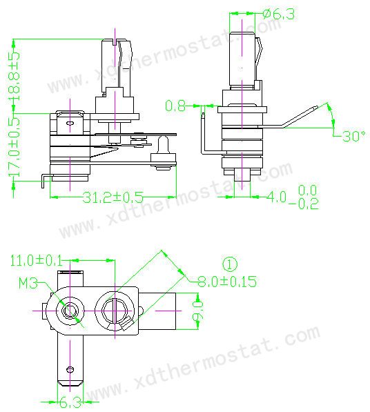 型号:XD702-10001、机械角度:270±5°2、规格:120VAC/15A3、耐压:1800V/2S 击穿电流:0.5mA 4、工作温度:128±6℃5、开机角度:40±10℃(室温20℃)