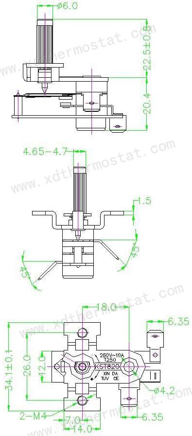 型号:KST820-15901、规格:250VAC/10A2、机械角度:300±5°3、工作温度:175±8℃4、机角度:100±10°(室温25℃)5、耐压:2000V 0.5Ma 1S
