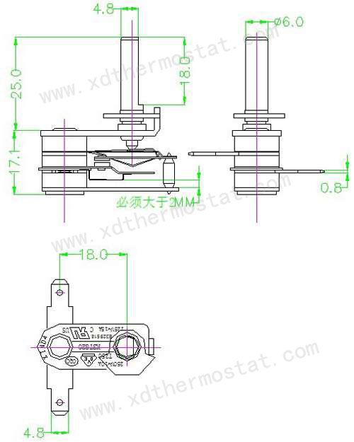 型号:KST820-16051、规格:250VAC/10A 125V/15A2、工作角度:180±5℃3、工作温度:150±7℃4、开机角度:40±5°(室温25℃)5、耐压:2000V/1S 0.5mA