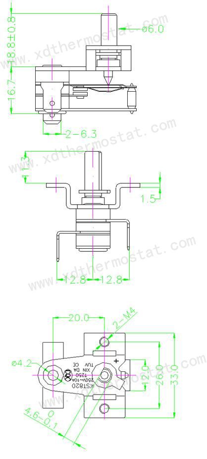 型号:KST820-11551、工作角度:300±5℃2、规格:250VAC / 10A 耐压:2000V 0.5mA 1S3、工作温度:90±5°4、接通角度:110°±15°(R/T25℃)
