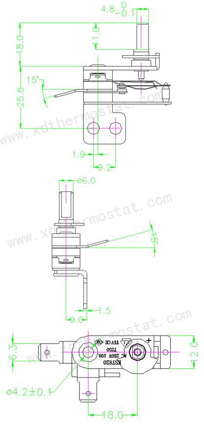 型号:KST820-13221、规格:250VAC/10A2、工作角度:296±5°3、工作温度:213±10℃4、通电角度:60±10℃(室温25℃)5、耐压:2000V/1S 击穿电流:0.5mA